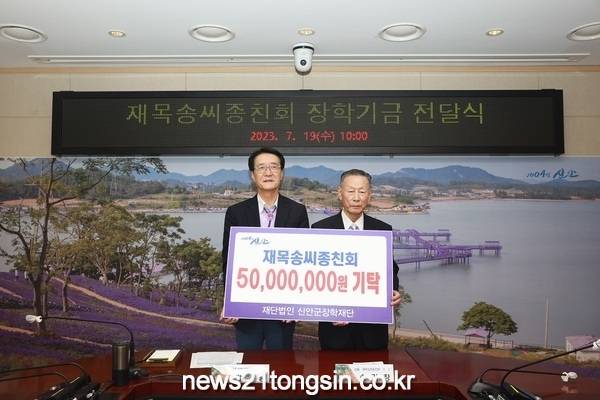 재목송씨종친회(회장 송기창) 임원들이 지난 19일 신안군청을 방문해 신안군장학재단(이사장 박우량)에 5천만 원을 기탁하여 관심을 받았다.
