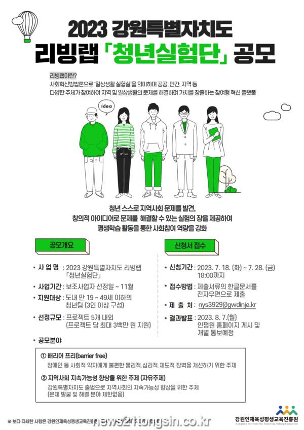 ▲ 강원인재육성평생교육진흥원, 2023 강원특별자치도 리빙랩「청년실험단」공모강원인재육성평생교육진흥원(원장 손인주)은 일상 속 평생학습 활동을 통한 청년 사회참여 역량강화 프로그램「2023 강원특별자치도 리빙랩 청년실험단」참여 팀을 7월 28일까지 모집한다.