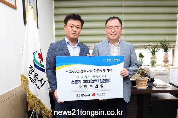 ▲  ㈜청후건설 정읍시에 270만원 상당 선풍기 30대 기탁뉴스21통신전북/김문기기자=정읍시 태인면에 소재한 ㈜청후건설(대표 손흥배)은 24일 정읍시를 방문해 선풍기 30대를 기탁했다.