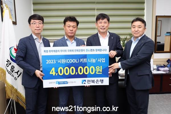 뉴스21통신전북/김문기기자=전북은행(은행장 백종일)은 24일 정읍시에 무더위 극복 여름용품으로 구성된 시원(COOL)키트 100박스(400만원 상당)를 전달했다.