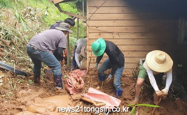 이들은 산사태로 토사가 밀려와 침수된 주택에서 흙과 돌더미를 치우며 피해 현장 복구에 힘을 보탰다.