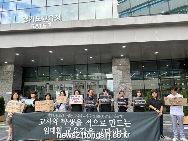 마지막으로 이들은 “임태희 교육감은 학교 구성원 모두가 서로의 인권을 존중하고 행복한 학교를 만들기 위한 노력이 미래교육의 중심, 새로운 경기교육을 만들어나가는 일이라는 것을 알아야 한다”고 경고하면서 ‘임태희 교육감은 학생인권과 교사인권 편가르기 중단하라!’, ‘임태희 교육감은 교사와 학생 모두의 인권을 살리는 대책을 마련하라!’는 요구가 담긴 손피켓을 경기도교육청에 붙이고 기자회견을 마무리했다.