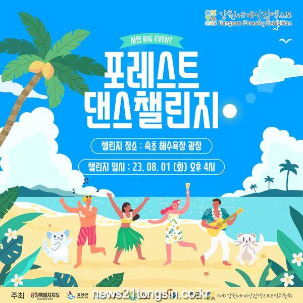 ▲ 강원세계산림엑스포 8월 1일 속초해변에서 「포레스트댄스 챌린지」개최강원세계산림엑스포조직위원회(위원장 김진태)는 「2023강원세계산림엑스포」 D-50일을 기념하여 8월 1일 오후 4시부터 속초해수욕장 광장에서 “포레스트댄스 챌린지” 활성화(붐 업) 행사를 개최한다고 전했다.