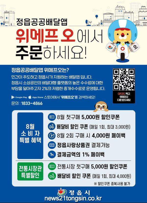 뉴스21통신전북/김문기기자=정읍시가 8월 한 달 동안 정읍시 공공배달앱위메프오가 시민들로부터 큰 인기를끌고있어 소비자 특별 할인 이벤트를 실시한다.