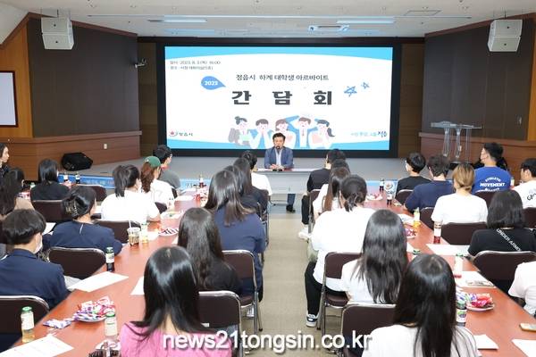 ▲  정읍시=하계 아르바이트 대학생과 간담회 개최뉴스21통신전북/김문기기자=정읍시(시장 이학수)는 지난 3일 정읍시청 대회의실에서 2023년 정읍시 하계 아르바이트에 참여 대학생 50여명과 소통의 시간을 가졌다.