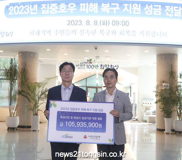 화성시(시장 정명근)가 8일 시민 및 공직자·공공기관 임직원들이 모금한 ‘집중호우 피해지역 복구 지원 성금’ 1억여원을 경기사회복지공동모금회에 전달했다.