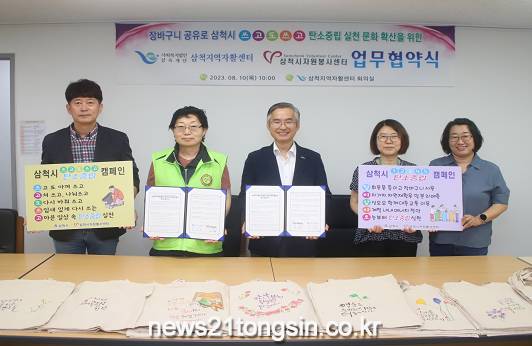 ▲ 사진=삼척시삼척시자원봉사센터(센터장 정영옥)와 삼척지역자활센터(센터장 오강석)는 8월 10일(목) 삼척지역자활센터 회의실에서 생활 속 탄소중립 실천 문화 확산을 위한 업무협약을 체결했다.