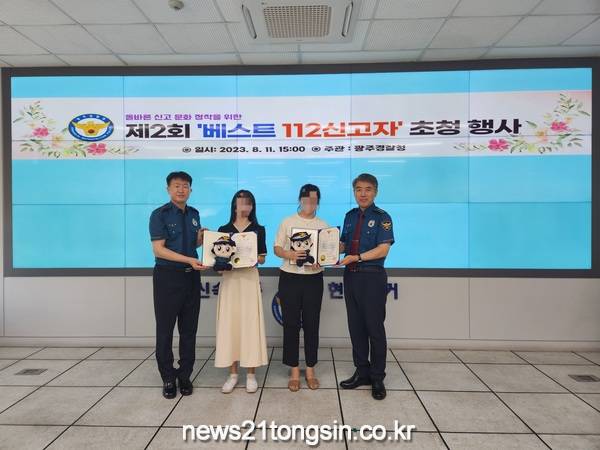 ▲ 베스트112신고자_[뉴스21통신/장병기 기자] 광주경찰청(청장 임용환)은 8. 11.(금) 오후 3시, 광주경찰청 112치안종합상황실에서 ‘제2회 베스트 112신고자’ 초청 행사를 개최하였다.