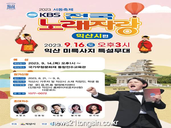 시는‘2023 익산 방문의 해’와‘2023 익산서동축제’를 기념해 오는 9월 16일 미륵사지 특설무대에서 ‘KBS 전국노래자랑’을 개최한다.