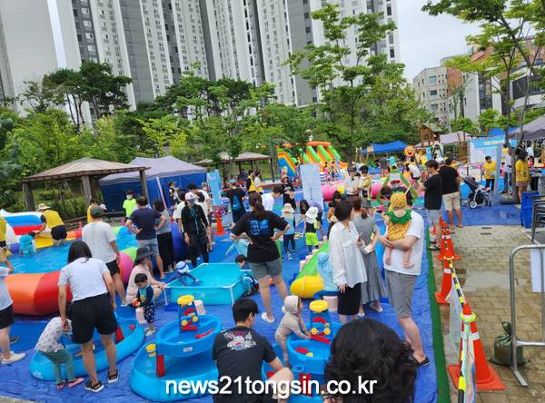 이날 무더운 날씨 속 시원한 여름을 즐기기 위해 400여 명이 넘는 어린이와 가족들이 방문했다. 물놀이장에는 에어바운스 수영장, 미끄럼틀 외에도 자석 낚시, 오징어 잡기 등 다양한 체험을 운영해 영·유아도 함께 참여했다.