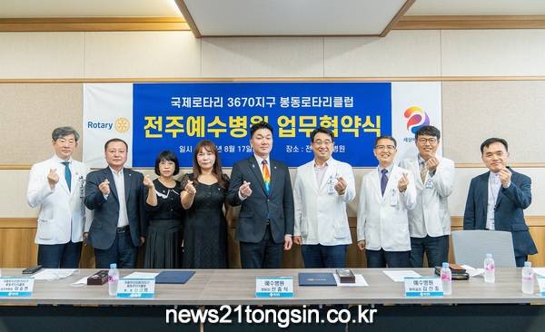 ▲  전주예수병원=국제로타리 3670지구 봉동로타리클럽 업무협약 뉴스21통신전북/김문기기자=전주예수병원(병원장 신충식)은 국제로타리3670지구 봉동로타리클럽 (회장 한진희)과 지역사회 봉사를 위한 업무협약을 체결했다고 17일 밝혔다.