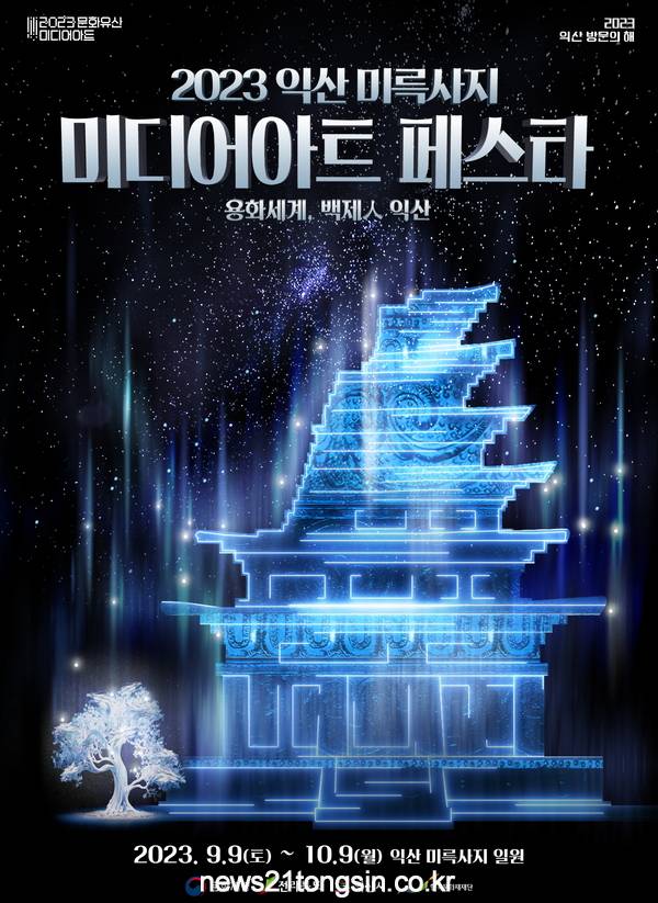 ▲  익산미륵사지 미디어아트페스타(포스터)익산시, 문화재청, 전라북도가 주최하는 '2023 익산 미륵사지 미디어아트 페스타'가 9월 9일 개막을 시작으로 10월9일까지 한층 향상된 프로그램을 담아 3년차의 문을 연다.