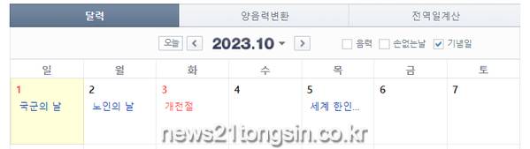 ▲  사진=네이버달력정부가 추석 연휴와 개천절 사이에 끼어있는 10월 2일을 임시 공휴일로 지정하는 방안을 검토하고 있다.