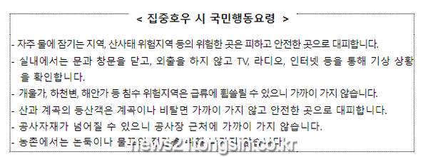 -호우특보시에는 재난문자, 마을방송 등 가용 가능한 홍보 수단을 적극 활용하여 외출 자제 등을 국민께 안내하고, 통제시에는 통제상황을 신속히 전파할 것