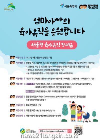 지원 대상은 ▲신청기준 서울시 1년 이상 거주 ▲중위소득 150% 이하 ▲2023년 1월부터 육아휴직을 시작해 연속 6개월 이상 지속 ▲고용보험 가입 후 육아휴직급여를 받는 부모 등이다.