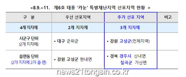 중앙재난안전대책본부(본부장 : 이상민 행정안전부 장관)는 이번에 선포되는 지역은 지난 8.11.~13. 기간 중 사전조사가 완료되어 14일에 우선 선포한 지역 외에 8.20.~24. 기간 중 실시한 중앙합동조사 결과, 선포요건을 충족하는 지역에 대하여 추가 선포하는 것으로, 강원 고성군은 면 단위에서 군 단위로 확대 선포되며, 경북 경주시‧칠곡군은 면 단위로 선포되는 것이라고 밝혔다.