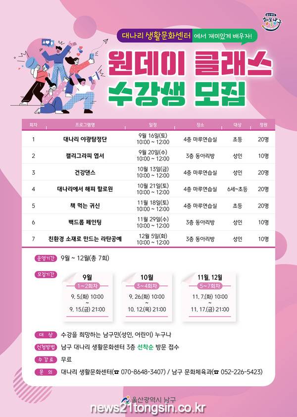 (뉴스21통신/최원영기자)=울산 남구 대나리 생활문화센터는 9월부터 12월까지 남구민을 대상으로 관심 있는 강좌나 체험활동을 하루 동안 배울 수 있는 ‘원데이 클래스’를 운영한다고 31일 밝혔다.