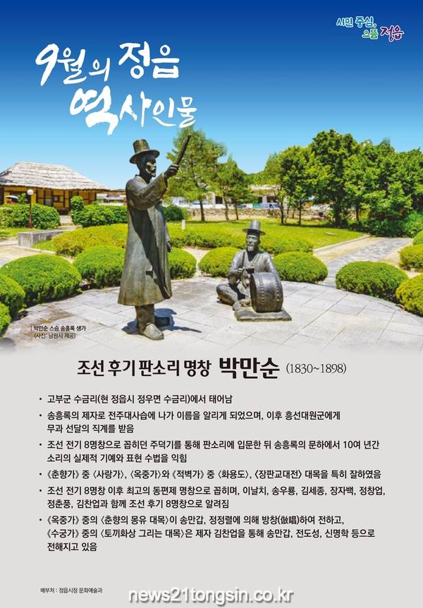 ▲ 정읍시청 제공조선 후기 8대 명창에 속하는 박만순(1830~1898)명창이 이달의 정읍 역사인물로 선정됐다.