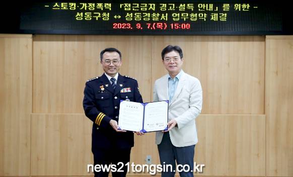 ▲ 사진=성동구서울 성동구(구청장 정원오)는 지난 7일 성동경찰서와 협약을 맺고 스토킹, 가정폭력 등 범죄 피해자를 보호하기 위해 ‘가해자 접근금지 경고‧설득 안내’ 사업을 추진한다.