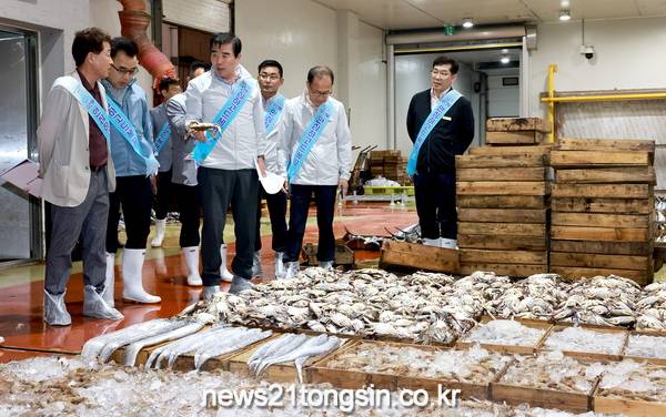 김 시장은 이날 수산물 안전 홍보 어깨띠를 매고 위판장을 방문해 어업인과 위판장 종사자들을 만나 수산물의 가격과 판매 동향에 대한 대화를 나누고 그들의 노고를 격려했다.