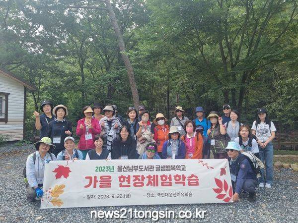(뉴스21통신/최원영기자)=울산남부도서관(관장 장삼수)은 22일 초등학력인정 문해교육 프로그램 ‘글샘행복학교’ 학습자 등 31명과 국립대운산 치유의숲에서 가을 현장체험학습을 했다.