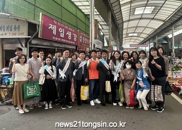강남교육지원청도 전인식 교육장을 비롯한 직원 20여 명이 남구 신정시장을 찾아 장을 보고 신정시장 상인회도 방문했다.