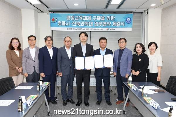 ▲ 정읍시= 전북과학대와평생교육체제 업무협약 체결정읍시는 26일 시청 회의실에서 평생교육체제 구축을 위해 전북과학대학교(총장 이영준)와 업무협약을 체결했다.