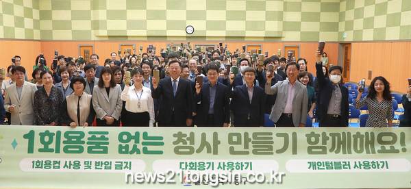 (뉴스21통신/임정훈기자) = 울산시 동구청은 10월 5일 오전 9시 동구청 2층 대강당에서 열린 4분기 직원 정례조회에서 ‘1회용품 없는 청사 만들기’ 선포식을 갖고 공공부문에서 선도적으로 1회용품 사용 근절을 위한 노력을 할 것을 다짐하였다.