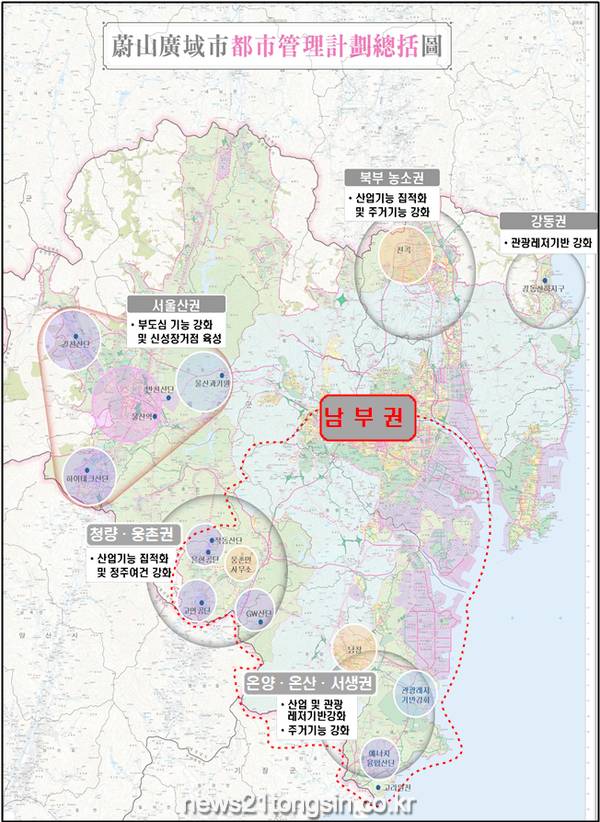 청량·웅촌권은 산업기능 집적화 및 국가산업단지 배후도시의 정주여건을 강화하고 온양·온산·서생권은 산업·물류 및 관광 레저기반과 주거기능을 강화하는 방향으로 개발하게 된다.
