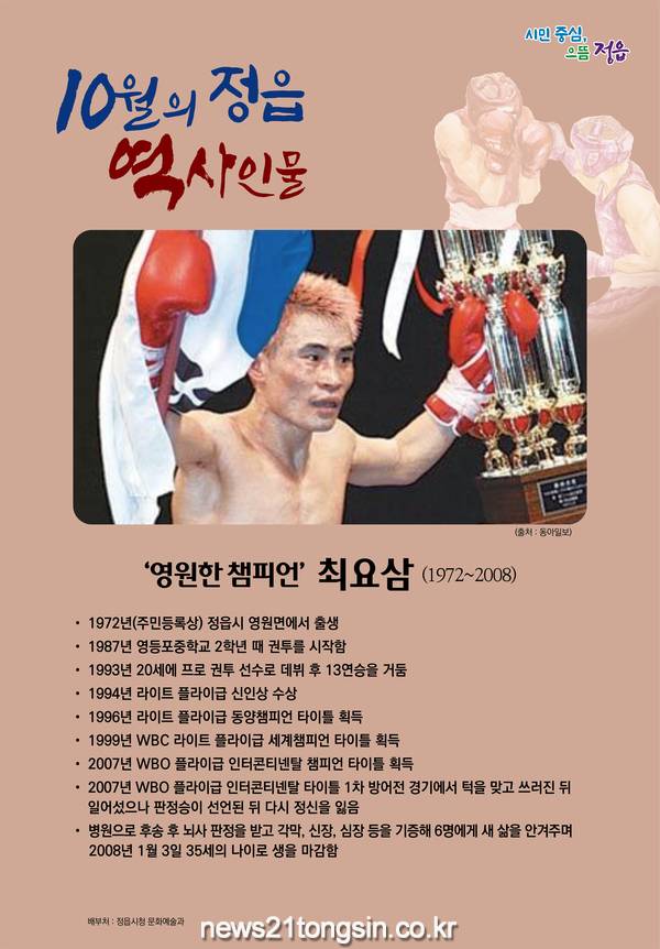 뉴수21통신전북/김문기기자=정읍시는‘영원한 챔피언’ 최요삼이 이달의 정읍 역사인물로 선정됐다고 6일 밝혔다.