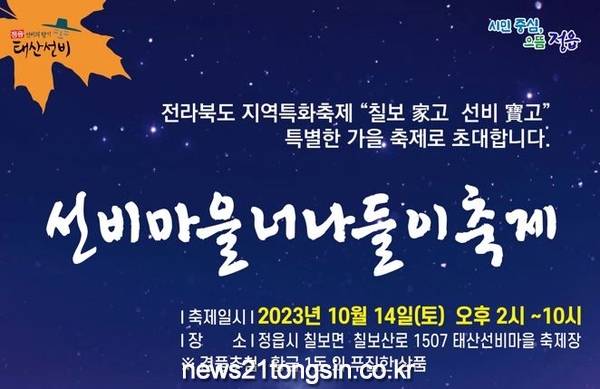 정읍시는 13일부터 15일까지 칠보면 태산선비마을 일원에서 ‘칠보 가고 선비 보고 축제’를 개최한다고 10일전했다.