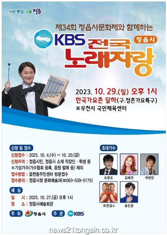 정읍시는 정읍사문화제가 펼쳐지는 오는 29일 오후 1시 한국가요촌 달하 일원(우천시 국민체육센터)에서 ‘KBS 전국노래자랑 정읍편’공개 녹화가 개최된다고 11일 밝혔다.