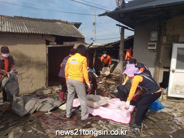 ▲ 정읍소방서= 신태인남성·여성의용소방대 봉사활동정읍소방서(서장 강봉화) 소속 정읍 신태인남성·여성의용소방대가 지난 7일 지체장애인 부부 집안 쓰레기 청소 및 환경정리 봉사활동을 진행했다.