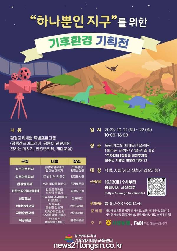 (뉴스21통신/우정석기자) = 울산광역시교육청(교육감 천창수) 기후위기대응교육센터(이하 기후교육센터)는 오는 21~22일 이틀간 울산지역 학생과 시민을 대상으로 기후환경기획전 ‘하나뿐인 지구’를 운영한다.