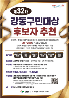 ▲ 사진=강동구강동구(이수희 구청장)는 오는 11월 17일까지 올해 강동을 빛낸 ‘제32대 강동구민대상’ 후보자를 추천 받는다고 밝혔다.