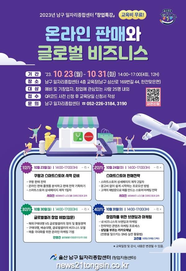 ‘온라인판매와 글로벌 비즈니스’교육은 오프라인으로 운영되며, QR코드로 사전신청이 가능하고, 교육관련 자세한 문의는 남구 일자리종합센터(☎052-226-3184)로 하면 된다.