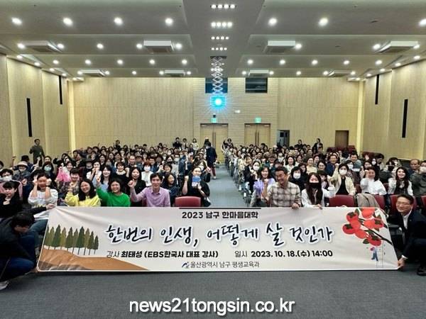 (뉴스21통신/최원영기자)=울산 남구(구청장 서동욱)는 18일 남구청 6층 대강당에서 EBS한국사 대표 강사 최태성 소장을 초청해 ‘한 번의 인생, 어떻게 살 것인가’라는 주제로 남구 한마음대학 강연을 개최했다.