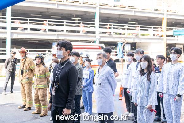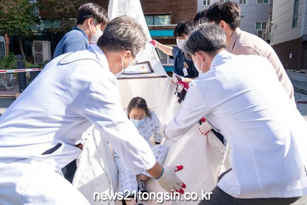 환자안전 시스템 구축을 위해 원내 화재 대비 체계와 소방서의 현장 대응 능력을 점검하는 이번 합동 훈련은 화재 발생 시 일어날 수 있는 인명 대피 활동을 훈련하고 피해를 최소화하는데 목적을 두고 진행됐다.