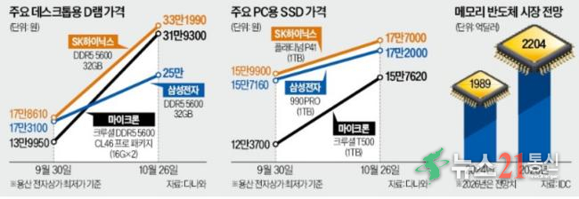[뉴스21 통신=추현욱 ] 메모리 반도체 가격 급등으로 PC, 스마트폰 등 정보기술(IT) 완제품 값이 뒤따라 오르는 ‘메모리플레이션’(memory+inflation)이 본격화했다. 1차적 원인은 인공지능(AI) 붐이 부른 ‘메모리 슈퍼 호황’이다. 메모리 기업들이 일반 D램 모듈보다 5~6배 비싼 고대역폭메모리(HBM)에 주력하며 범용 D램 공급이 부...