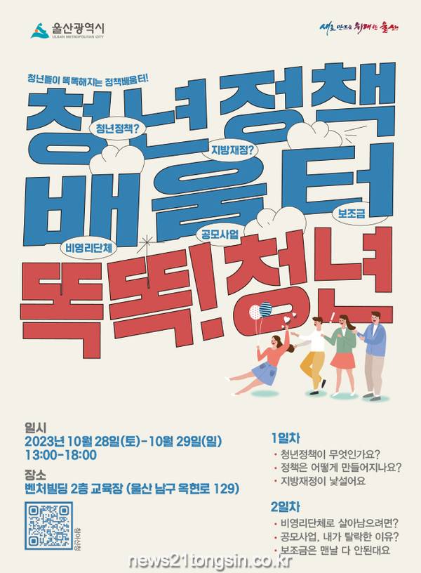 (뉴스21통신/우정석기자) = 울산시는 10월 28일과 29일 양일간 청년일자리센터 교육장(울산 남구 옥현로129, 벤처빌딩 2층)에서, 2023년 청년정책배움터 ‘똑똑! 청년’을 개최한다고 밝혔다.