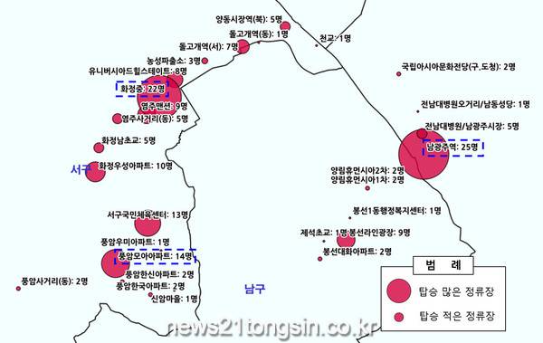 이를 위해 광주시는 지난 4월 한 달간 시내버스 장애인 탑승객 현황 데이터에서 장애인이 자주 이용하는 일반버스 상위 노선과 버스번호를 추출했다. 장애인 탑승데이터와 차량번호별 저상버스 여부를 매칭해 시간대별, 정류장별 장애인 탑승객을 분석하고, 이를 시각화한 것이다.