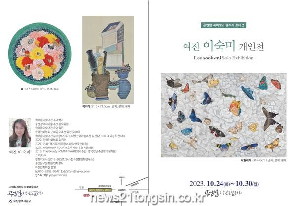 (뉴스21통신/최원영기자)=울산 남구문화원(원장 고문구)은 오는 24일부터 30일까지 공업탑지하보도갤러리에서 일주일간 여진 이숙미 작가 초대전을 개최한다고 밝혔다.