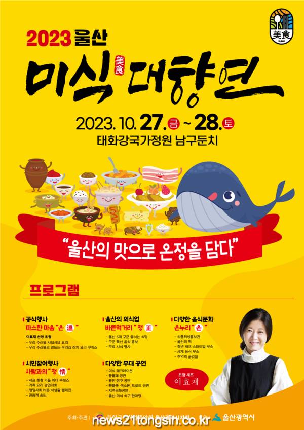 (뉴스21통신/우정석기자) = 울산시는 10월 27일(금)과 28일(토) 양일간, 태화강국가하천 남구둔치에서 음식문화축제 ‘2023 울산 미식(美食) 대향연’ 행사를 개최한다고 밝혔다.