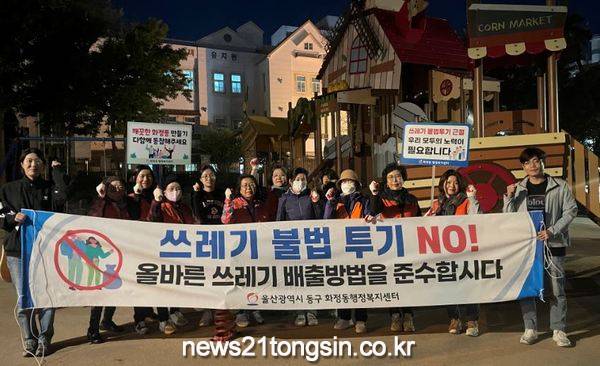 (뉴스21통신/임정훈기자) = 울산 동구 화정동 자생단체(통장회장 임영숙)는 10월 27일 오후 8시에 공한지 등 환경취약지 일대에서 불법투기 야간 단속 및 쓰레기 무단투기 근절 거리 홍보 캠페인 활동을 실시하였다.