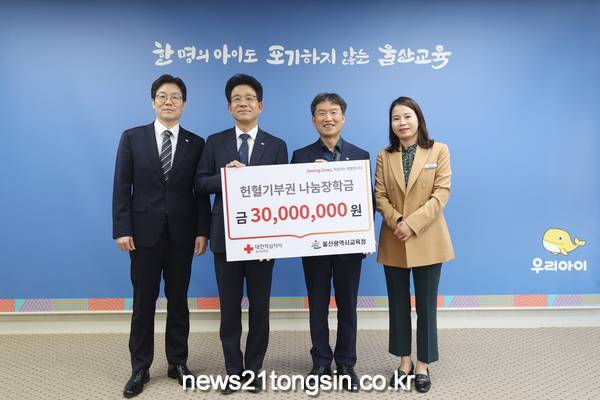 (뉴스21통신/우정석기자) = 대한적십자사 울산혈액원(원장 최인규)이 30일 헌혈기부권 나눔장학금 3,000만 원을 울산광역시교육청(교육감 천창수)에 전달했다.