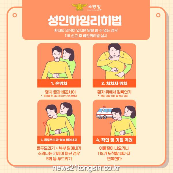 강봉화 소방서장은 “음식물이나 이물질로 인한 기도폐쇄 사고 발생 시 4분 이내에 의식을 잃게 되므로 신속한 응급처치가 매우 중요하다”며 “하임리히법, 심폐소생술 등 응급처치 방법을 미리 익혀두시길 바란다”고 말했다.