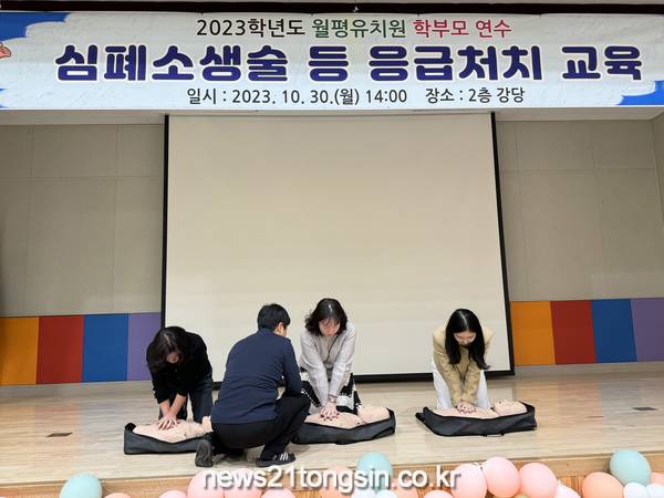 학부모들과 교직원들은 유치원과 가정에서 발생할 수 있는 응급 상황에 대응할 수 있는 유아 심폐소생술, 하임리히법 등을 박영선 한국안전교육연합회 대표의 실전 위주 연수를 통해 배웠다.