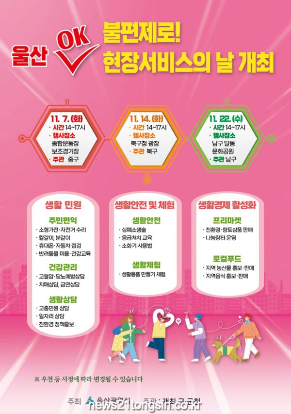 (뉴스21통신/우정석기자) = 울산시가 지역 주민의 생활 편의를 위해 ‘불편제로! 울산 오케이(OK)현장서비스의 날’을 개최한다.