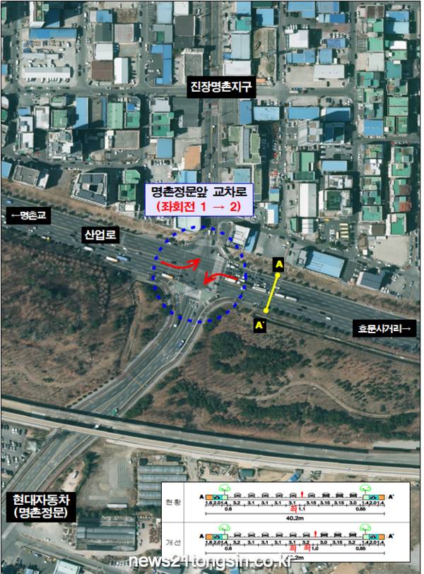 (뉴스21통신/우정석기자) = 울산시는 북구 명촌정문앞 교차로 교통체계를 개선하기 위해 좌회전 차로를 1개 차로 늘려(1개→2개) 출․퇴근 시간의 만성적인 교통체증을 완화할 계획이라고 밝혔다.