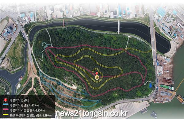 대삼학도 둘레길 1.2km는 '황토 맨발길'로 재조성되며, 정상까지 무장애길 1.8km를 신규 노선으로 구상한다.